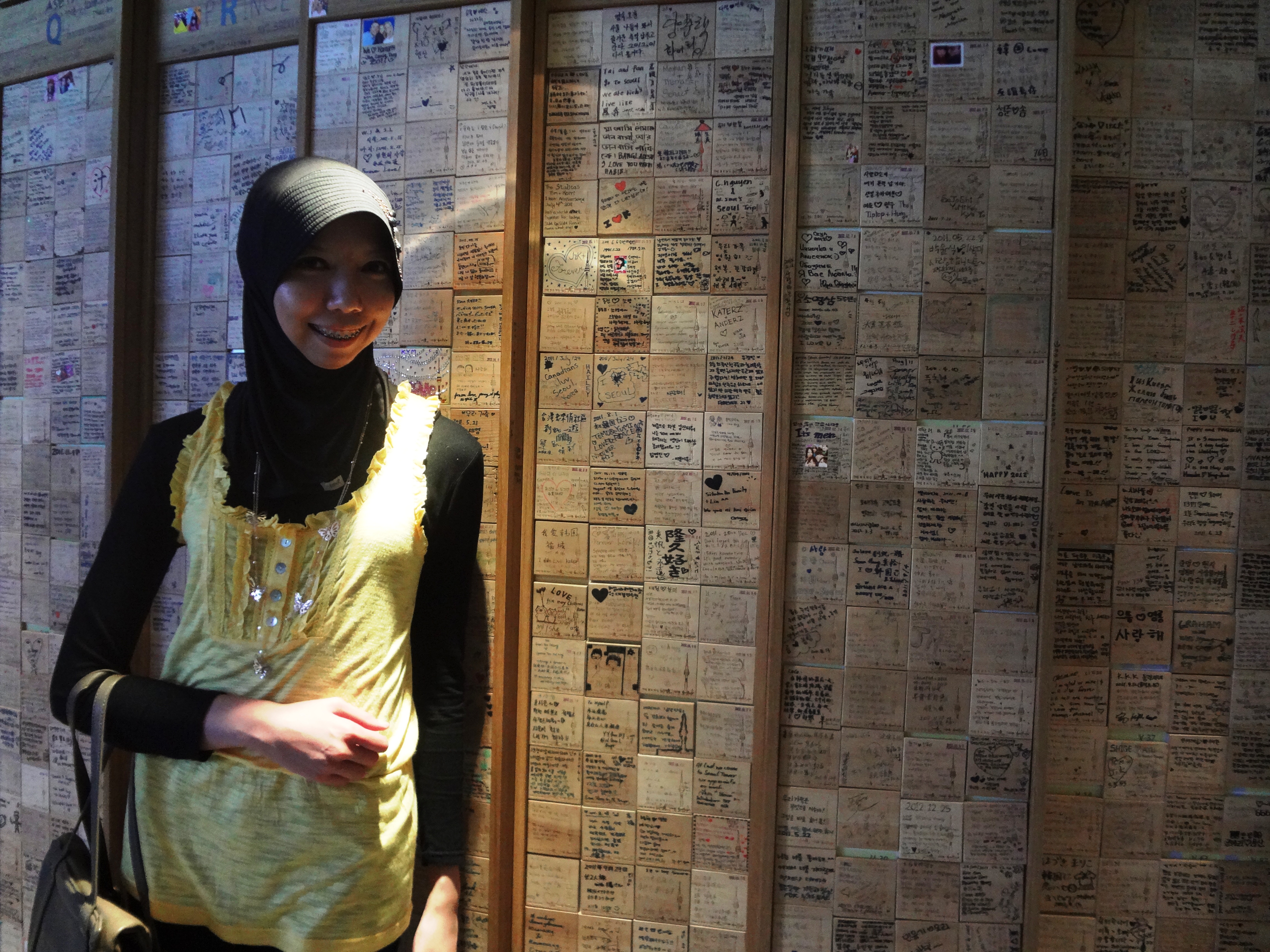 Di depan kandang kucing, terdapat sebuah bangunan bertingkat yang berisi banyak sekali lukisan dinding. Di lantai paling atas, gue menemukan dinding yang dipenuhi oleh coretan. Jika dilihat dari dekat, dinding itu bertuliskan pesan-pesan cinta yang ditinggalkan oleh para pengunjung. Sepertinya orang-orang Korea emang percaya banget ya, sama mitos-mitos romantis seperti itu…