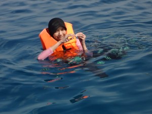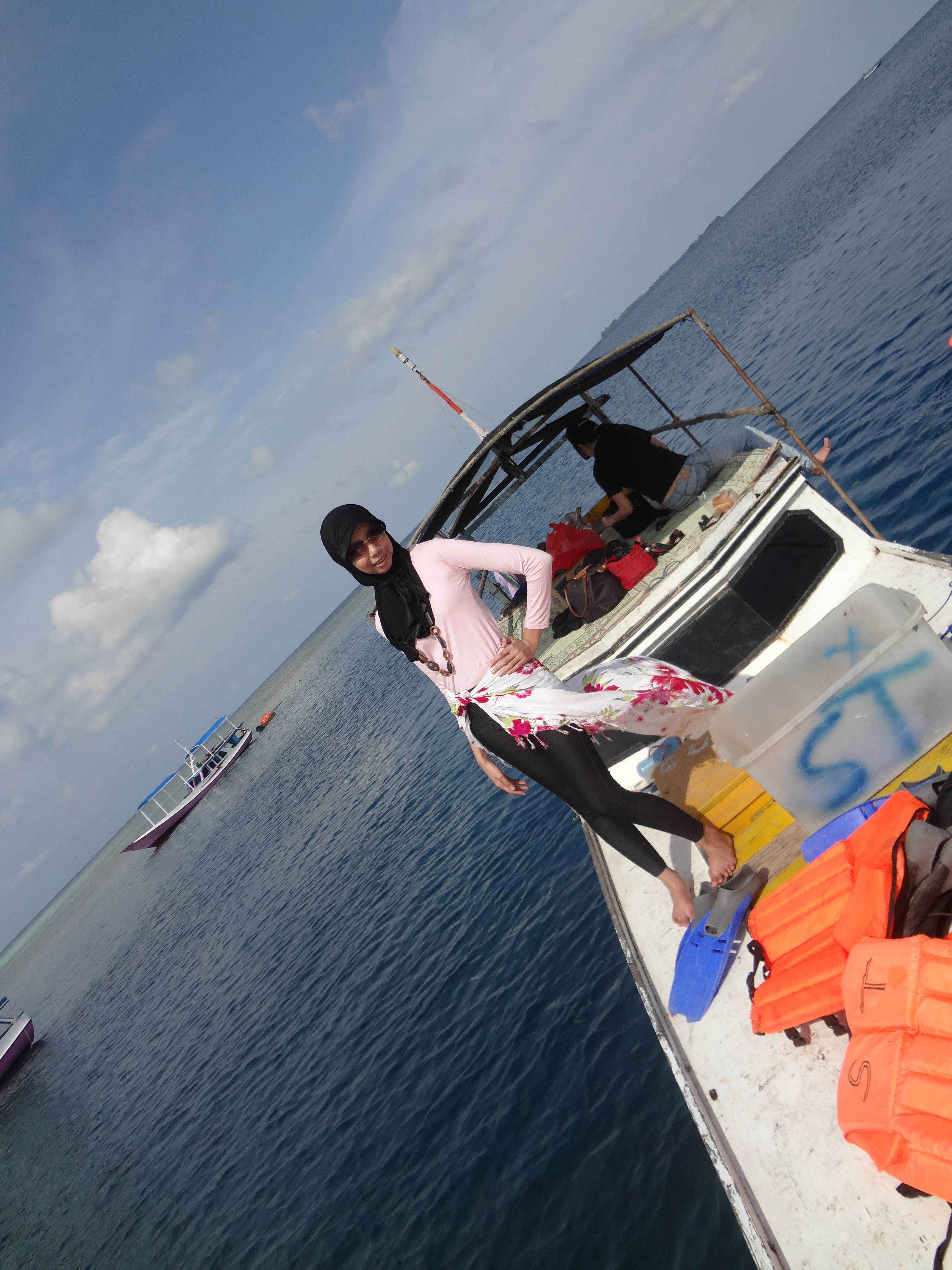Fin berhasil terpasang, gue coba lagi snorkeling, dan yah… masih gagal juga. Trus tau-tau aja gue udah sampe tempat yang karangnya tuh besar-besar banget. Dengkul gue sempet nabrak karang, legging gue sampe sobek di bagian lutut. Yang ada gue malah jadi ngeri… tambah ngeri saat dengar di karang-karang itu suka ada bulu babinya! Gue pun memutuskan untuk putar balik dan kembali naik ke perahu.